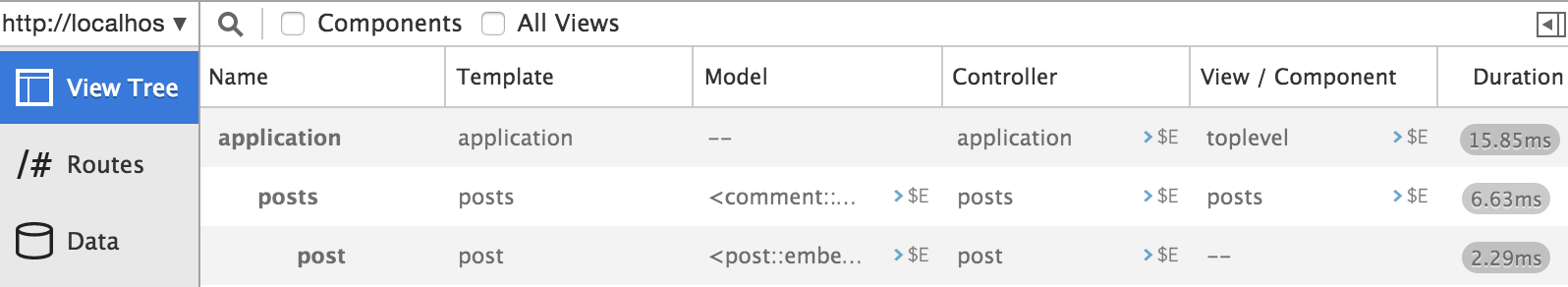 The View Tree shows you the currently rendered templates, models, controllers, and components, in a tree format. Click on the View Tree menu on the left to see these.